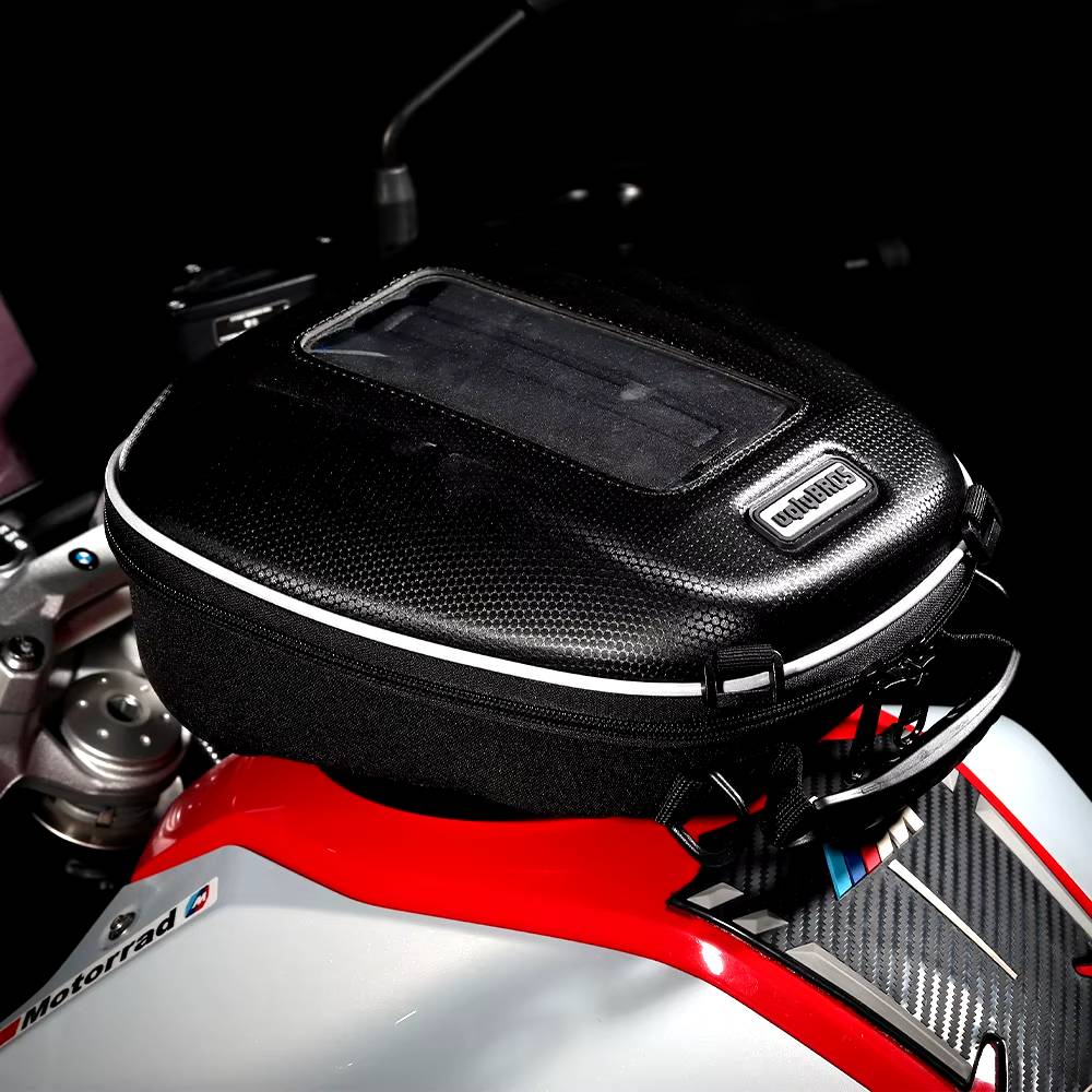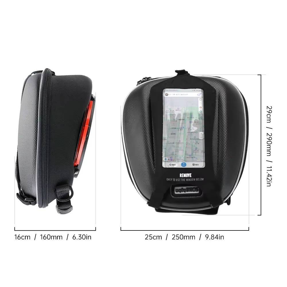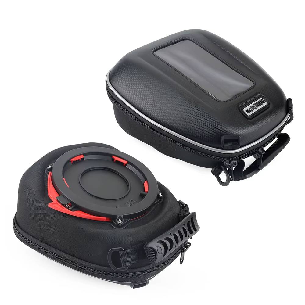 - Montare ușoară și sigură: Se prinde rapid de rezervorul motocicletei printr-un sistem de prindere magnetic sau cu chingi reglabile, în funcție de model.
